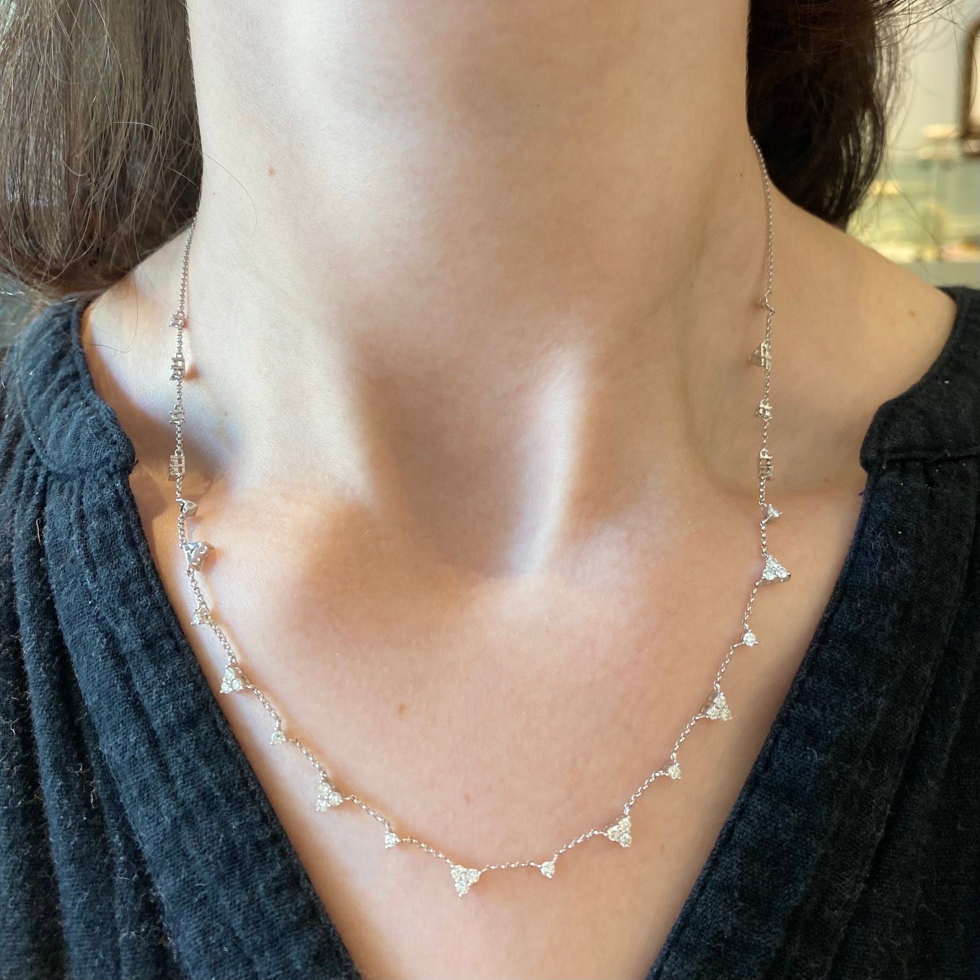 Adjustable white gold alternating diamond and diamond trio necklace