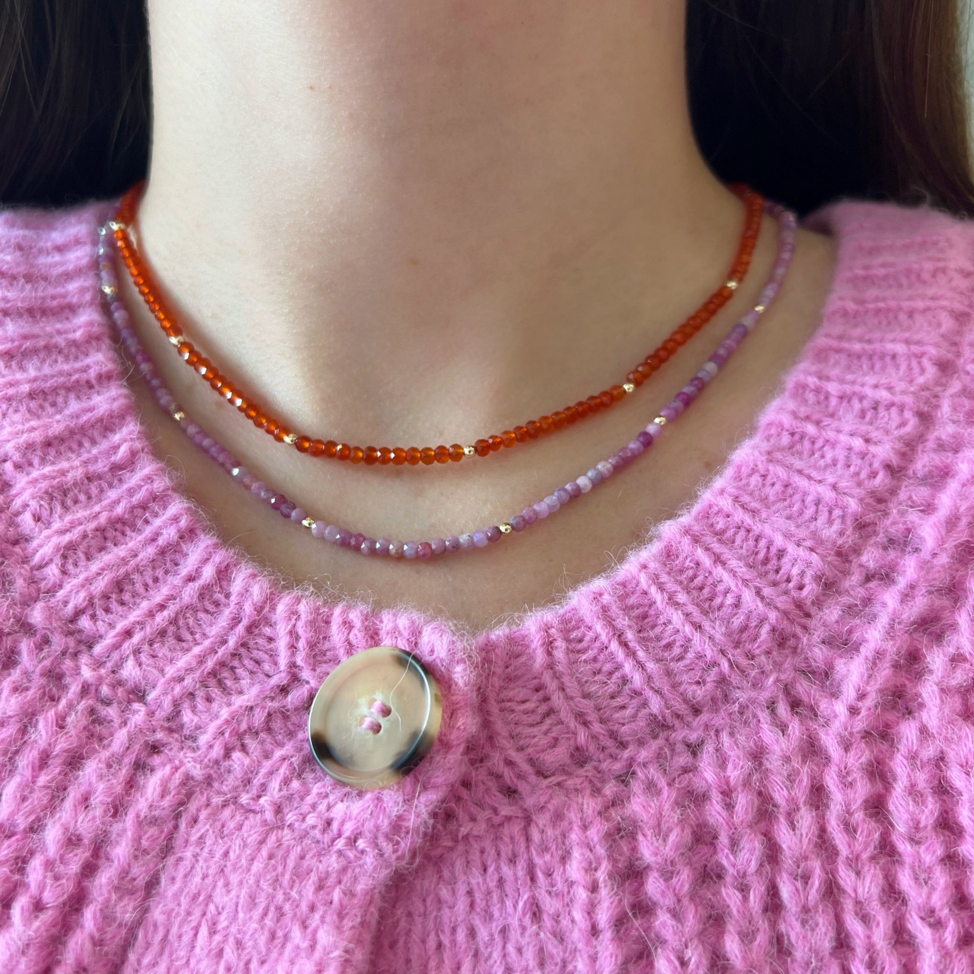 This beaded carnelian necklace features 14k yellow gold accents and a fishhook clasp.