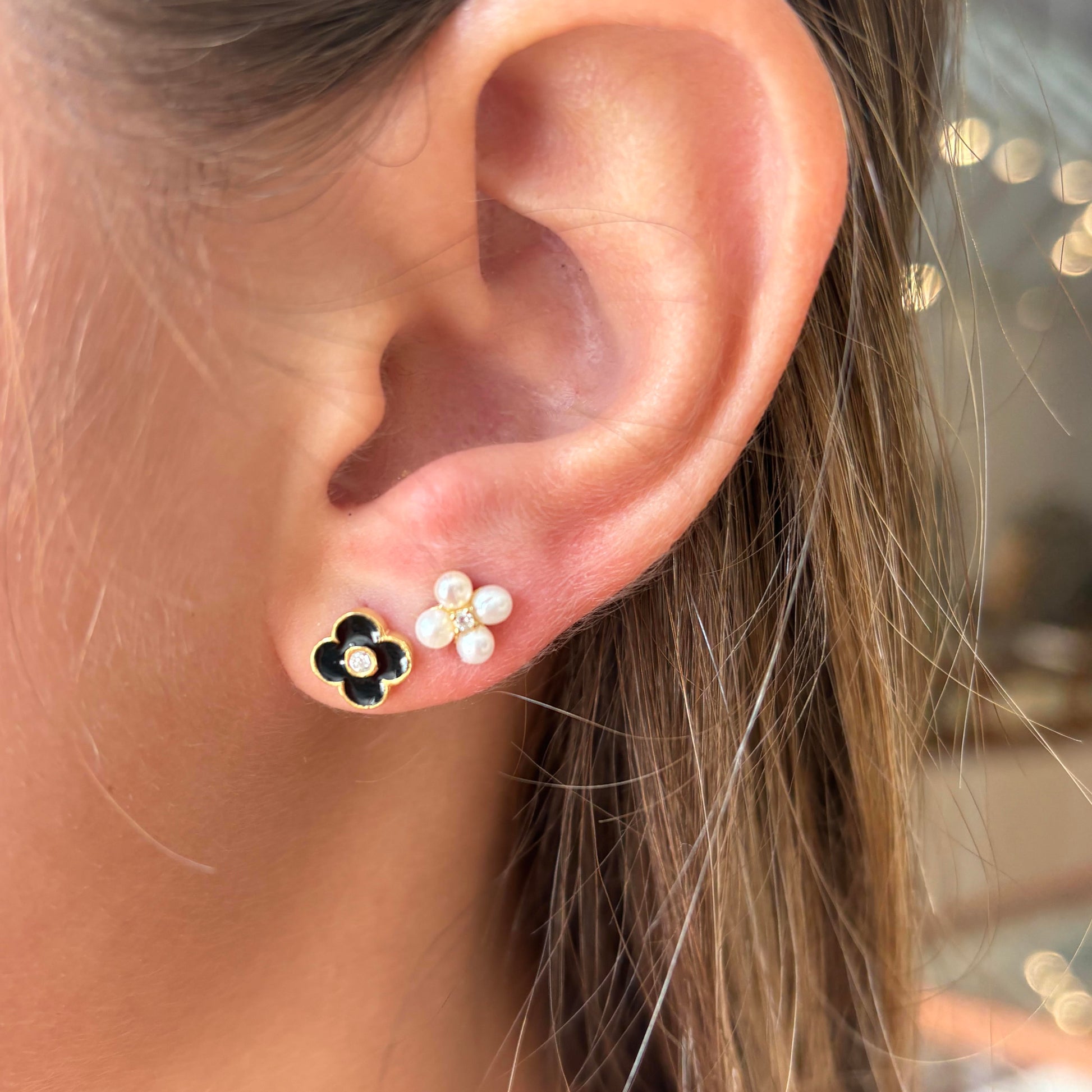Gold Vermeil Black Enamel Clover Studs with CZ middle