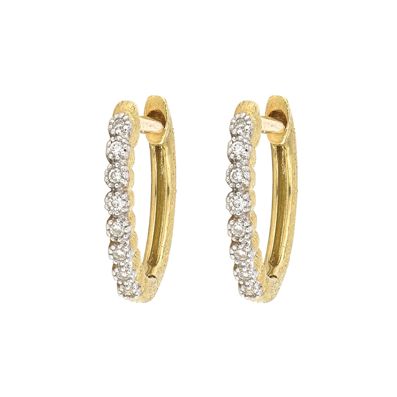 From the Jude Frances Provence Champagne Collection, the Delicate Provence Champagne Hoop Earrings feature bezel set round diamonds in 18K yellow gold with the signature brushed JFJ finish.