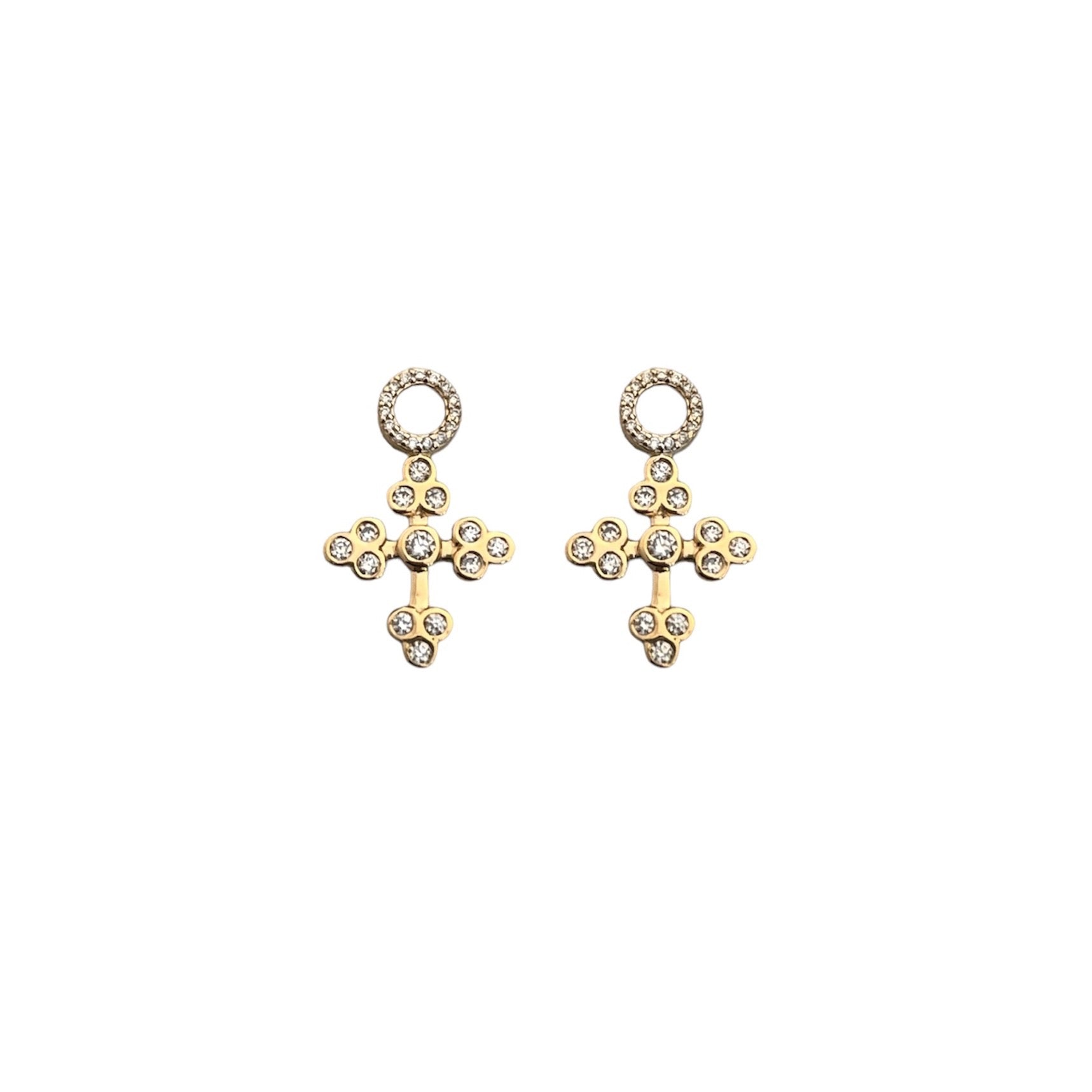 14k yellow gold diamond cross huggie charms in a bezel setting.