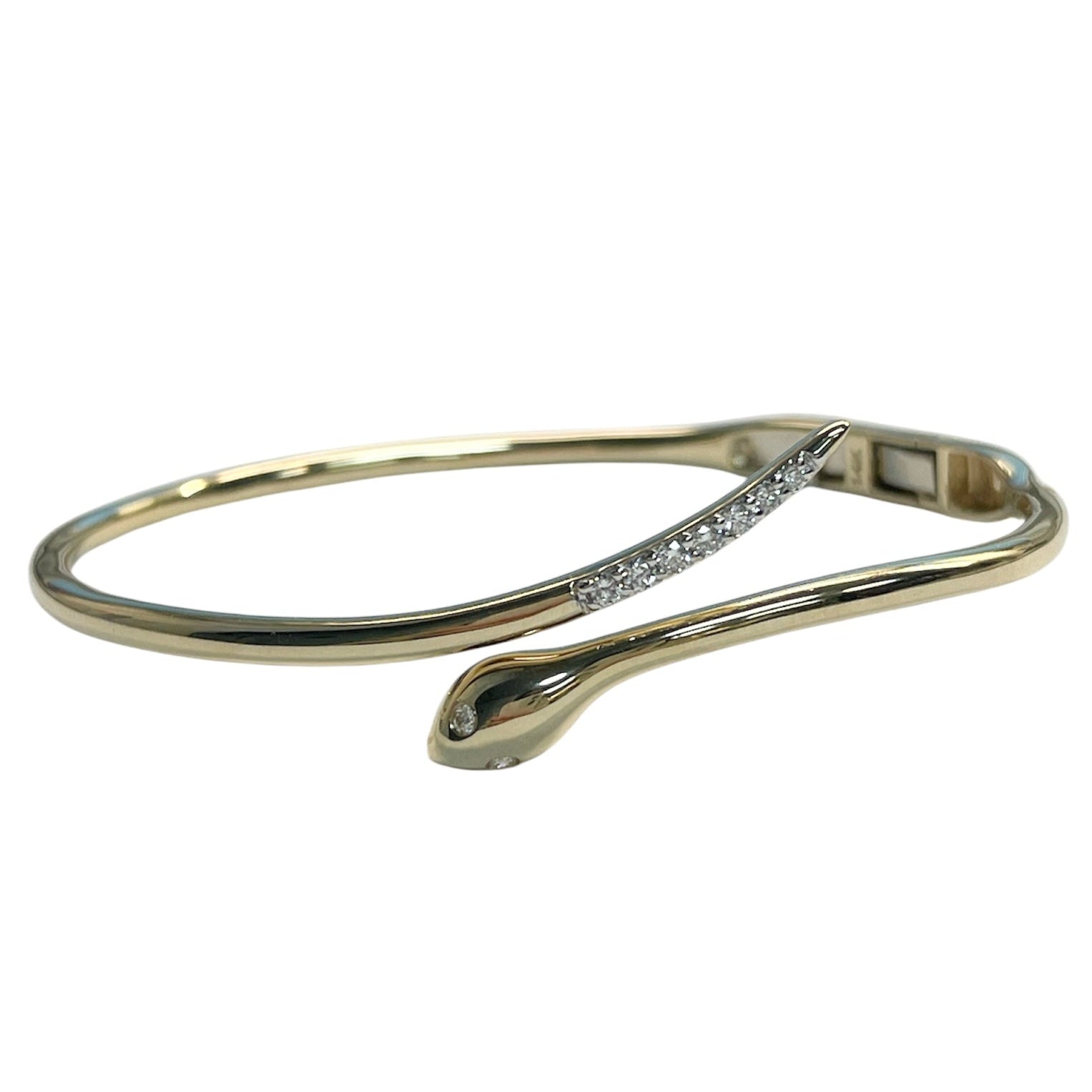Yellow gold hinged snake bracelet featuring a diamond tail and eyes