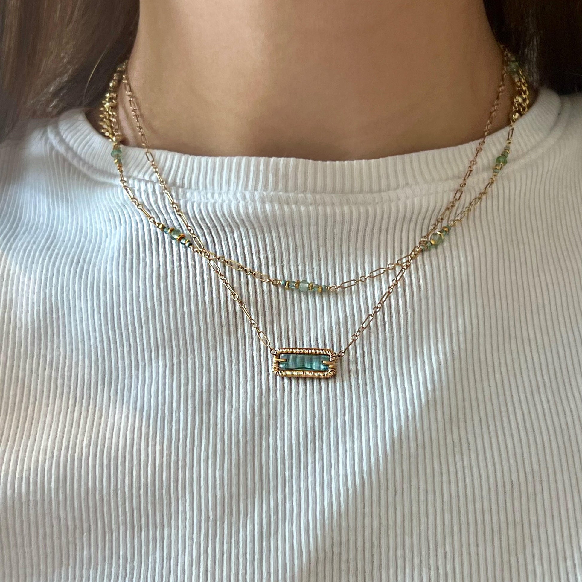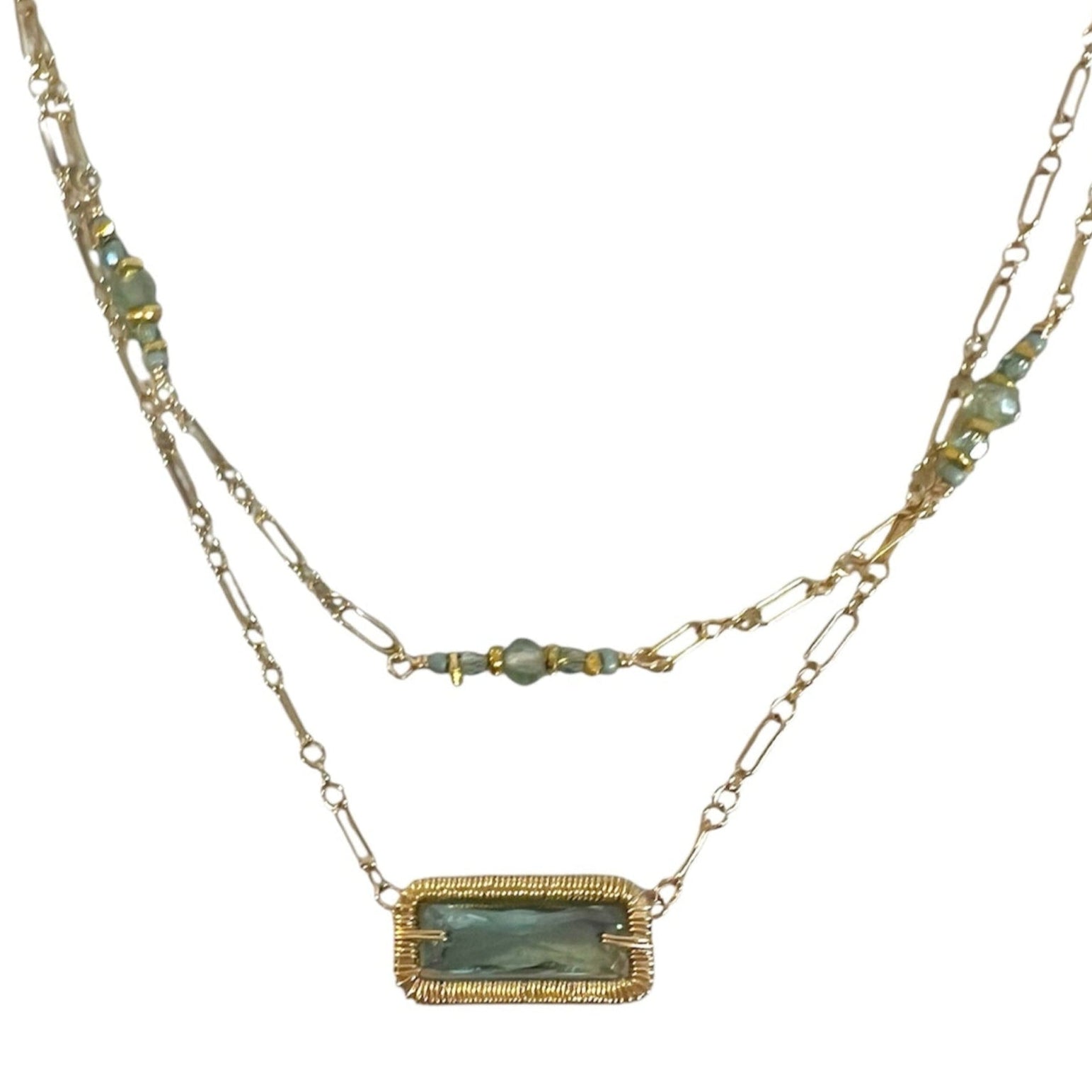 Wire wrapped green quart on a gold fill chain and a quartz beads wire wrapped on a second gold fill chain