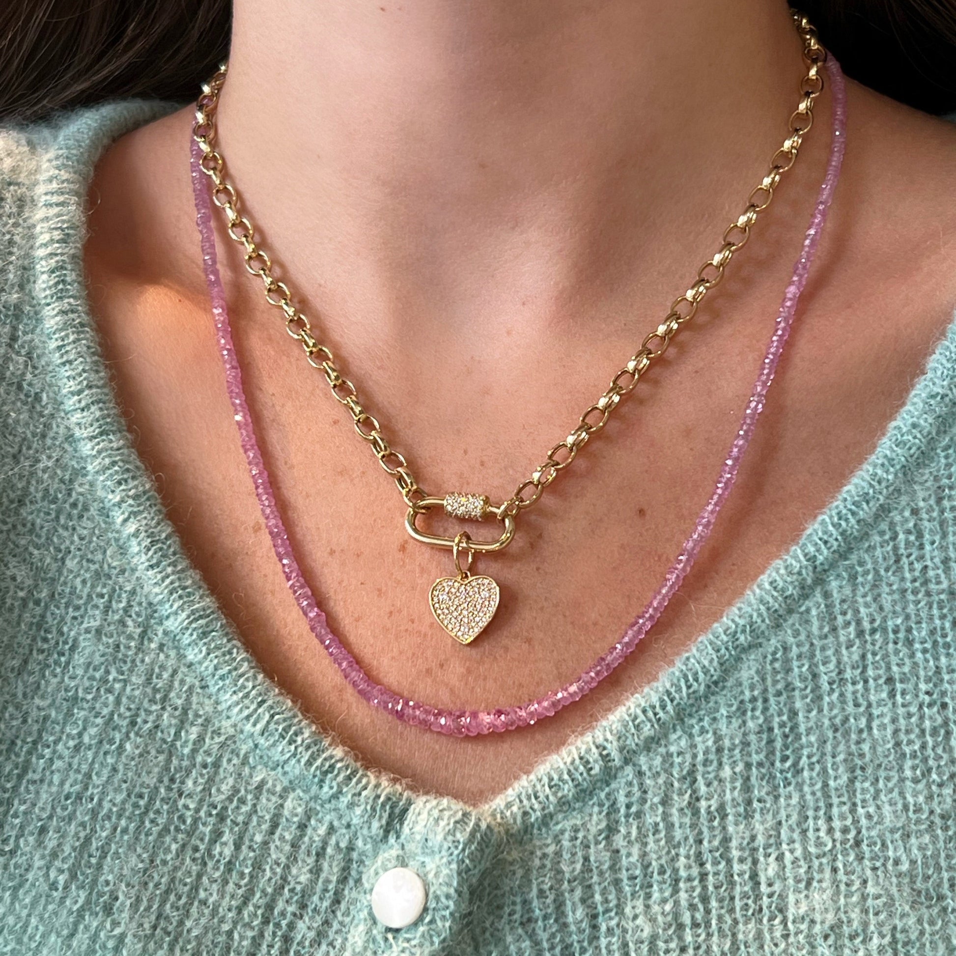 Yellow gold rolo chain with pave diamond carabiner enhancer