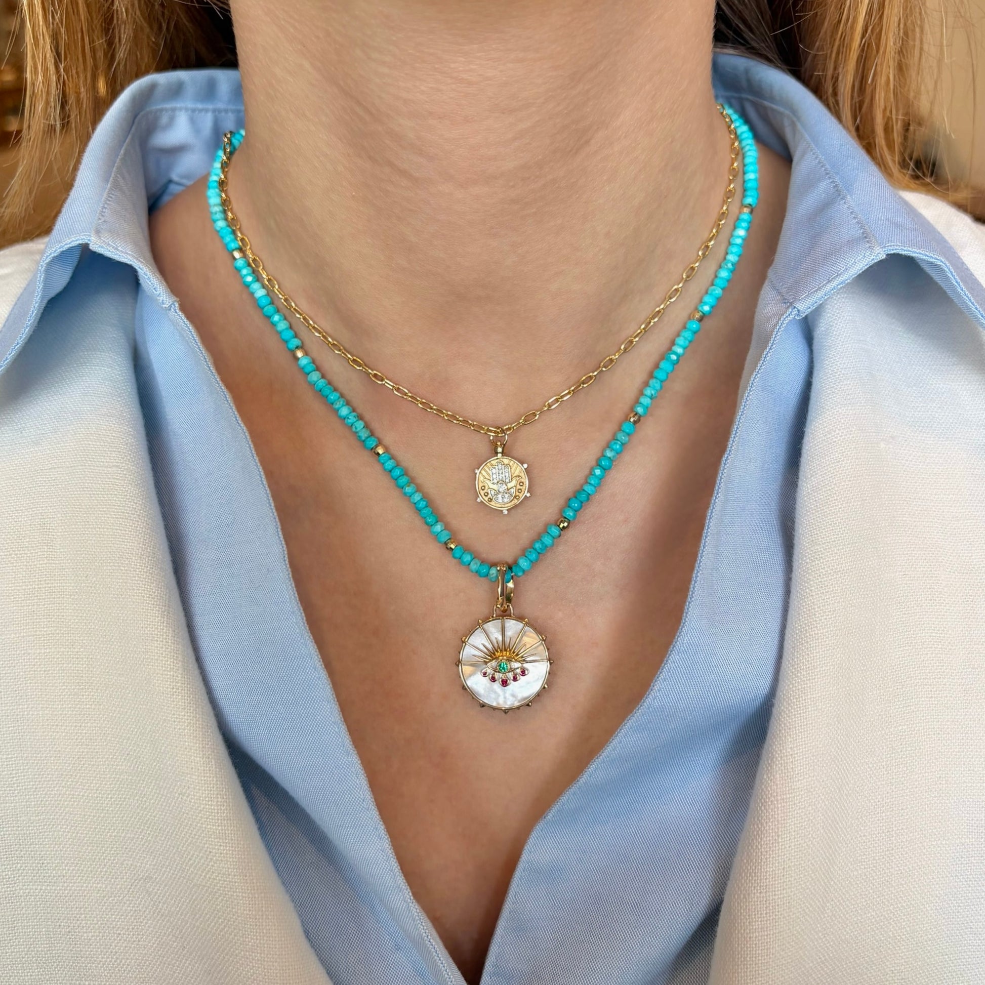 One side features a protective evil eye in 14k yellow gold with ruby and emerald accents over mother of pearl while the flip reveals a diamond-studded lotus flower on mother of pearl. Includes a 14kt yellow gold oval bale that opens.