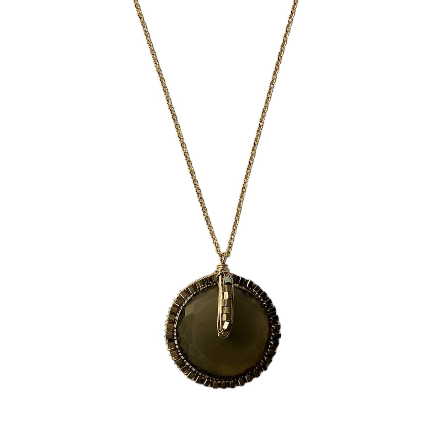 Round gray moonstone surrounded with wire wrapped gold fill beads on a gold fill chain