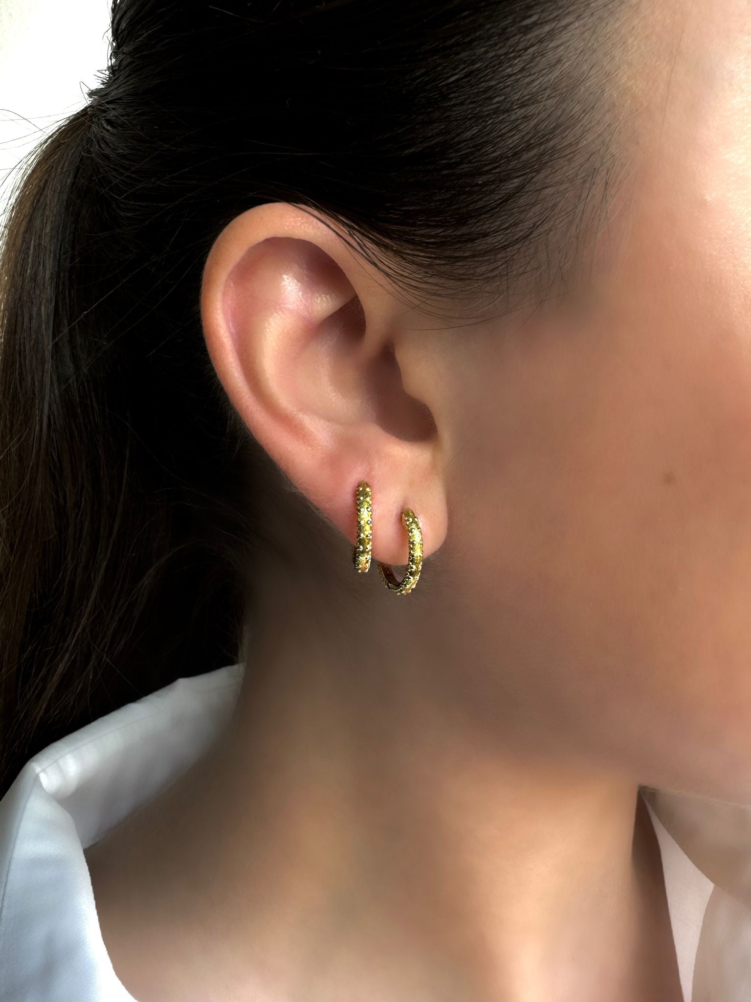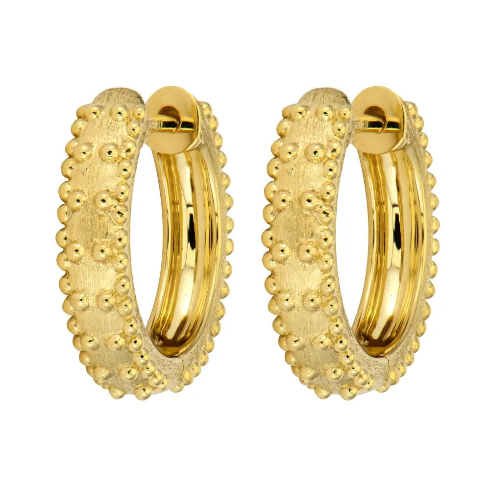 From the Moroccan Collection, the Plain Gold Hoop Earrings with Trio Beaded Detail creates a pattern motif set in 18k yellow gold brushed in the signature JFJ finish. This hoop is a small everyday hoop.