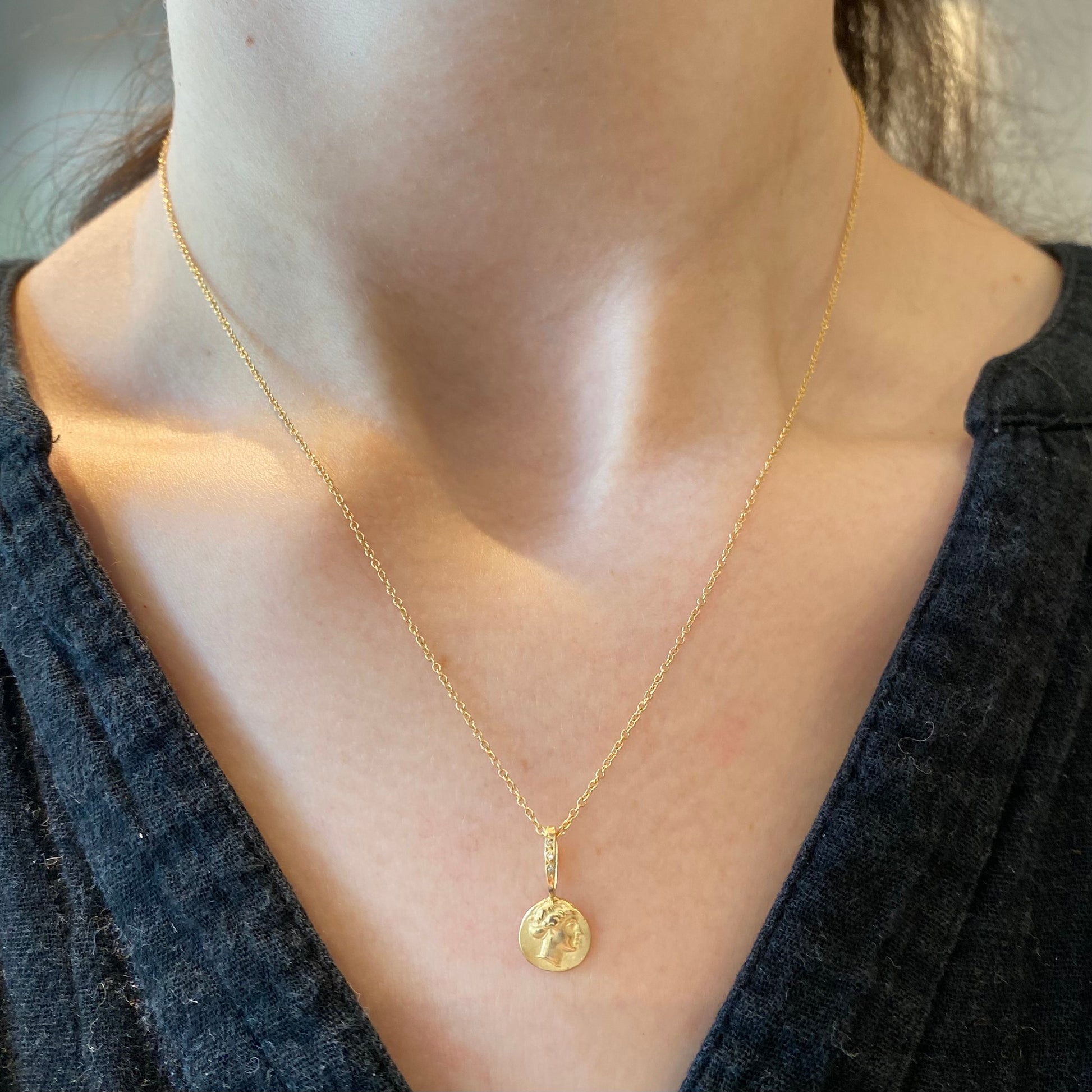 Motherhood artifact necklace set in gold with diamond accents. Two sided: