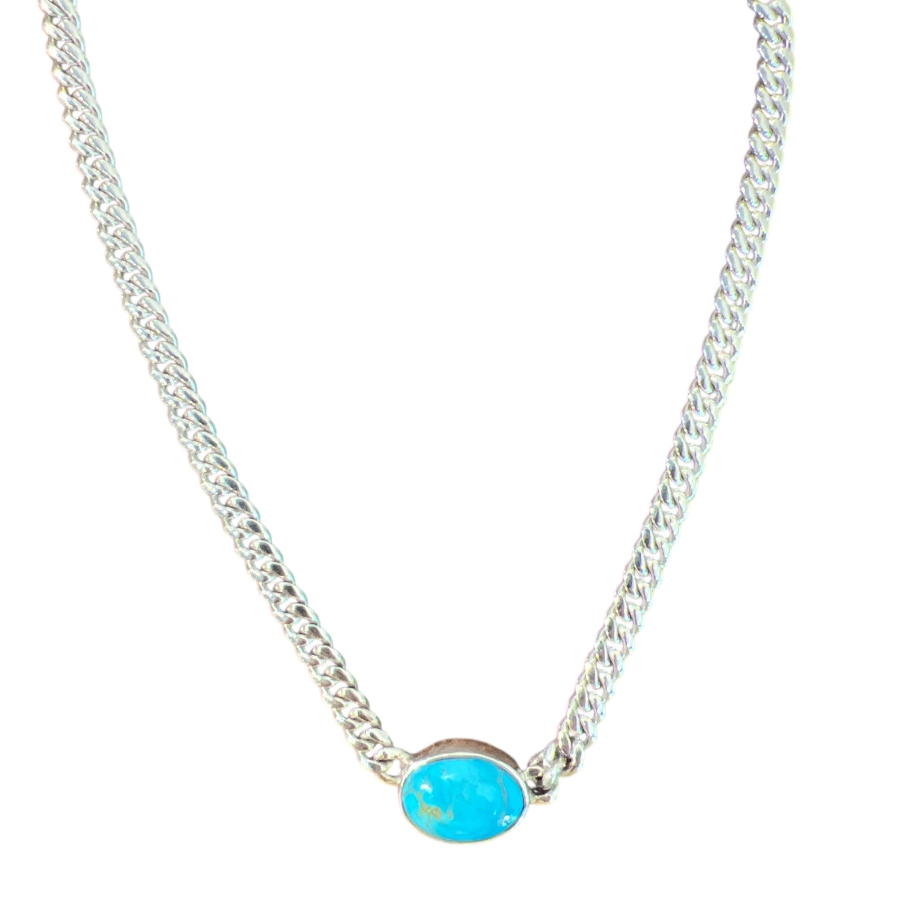 Oval turquoise bezel set horizontally on a sterling silver curb chain