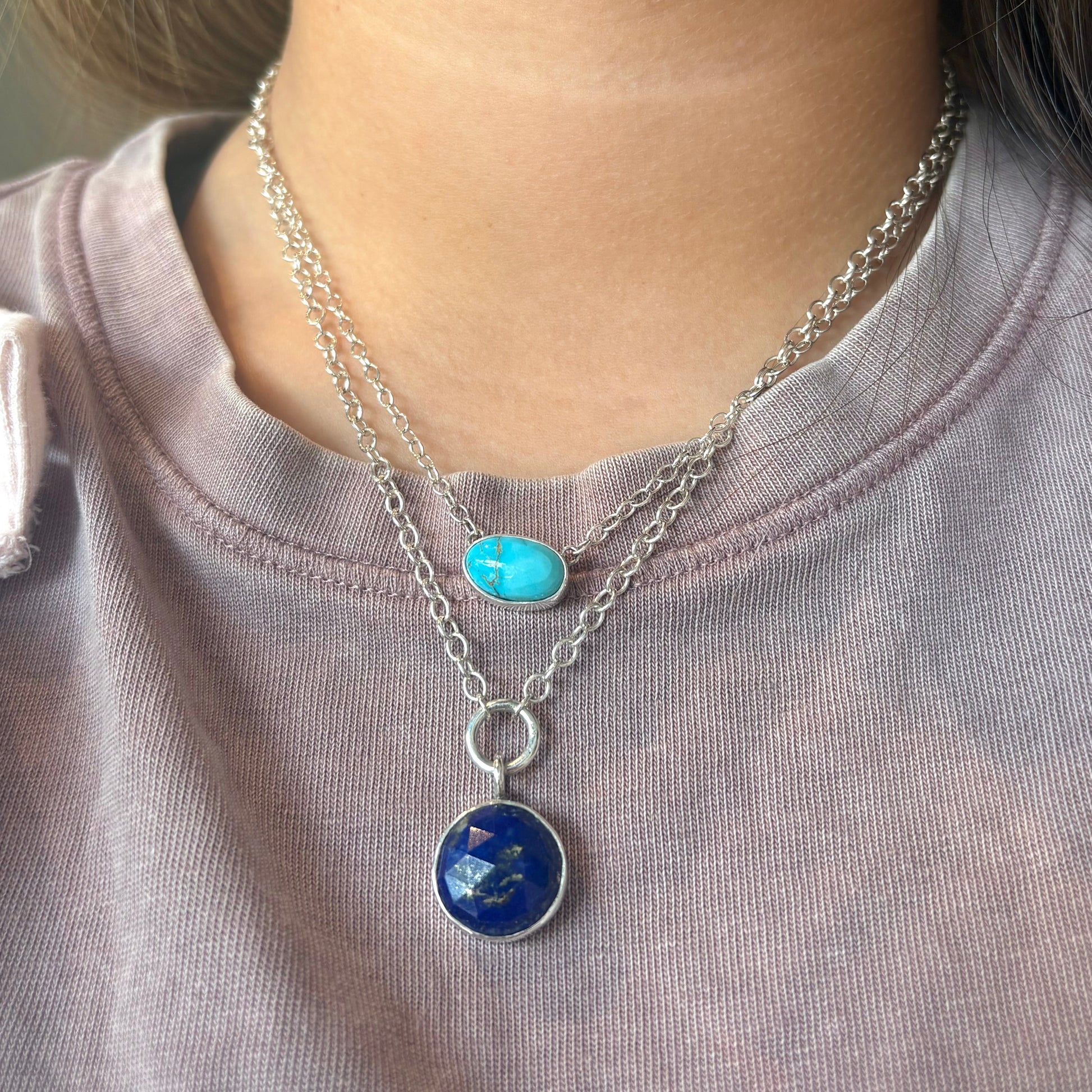 Oval turquoise bezel set horizontally on a sterling silver chain