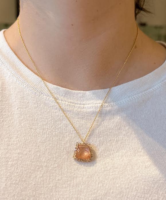 Peach rose quartz surround with wire wrapped crystals on a gold fill chain