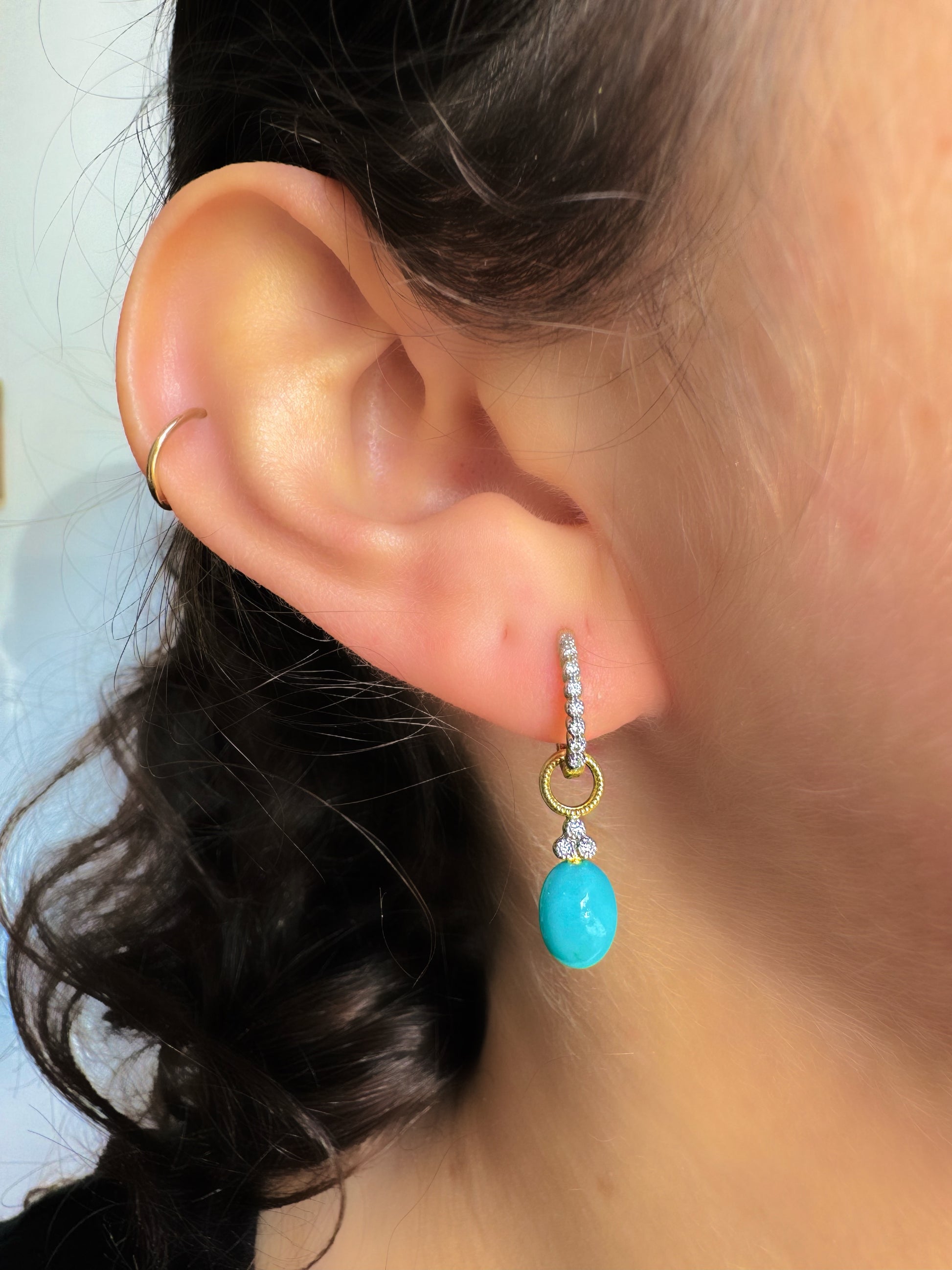 From the Provence Champagne Collection, the Provence Champagne Briolette Earring Charms features an oval cabochon turquoise set in 18kt gold accented by bezel set round diamond trios. Hoops and earring charms sold separately