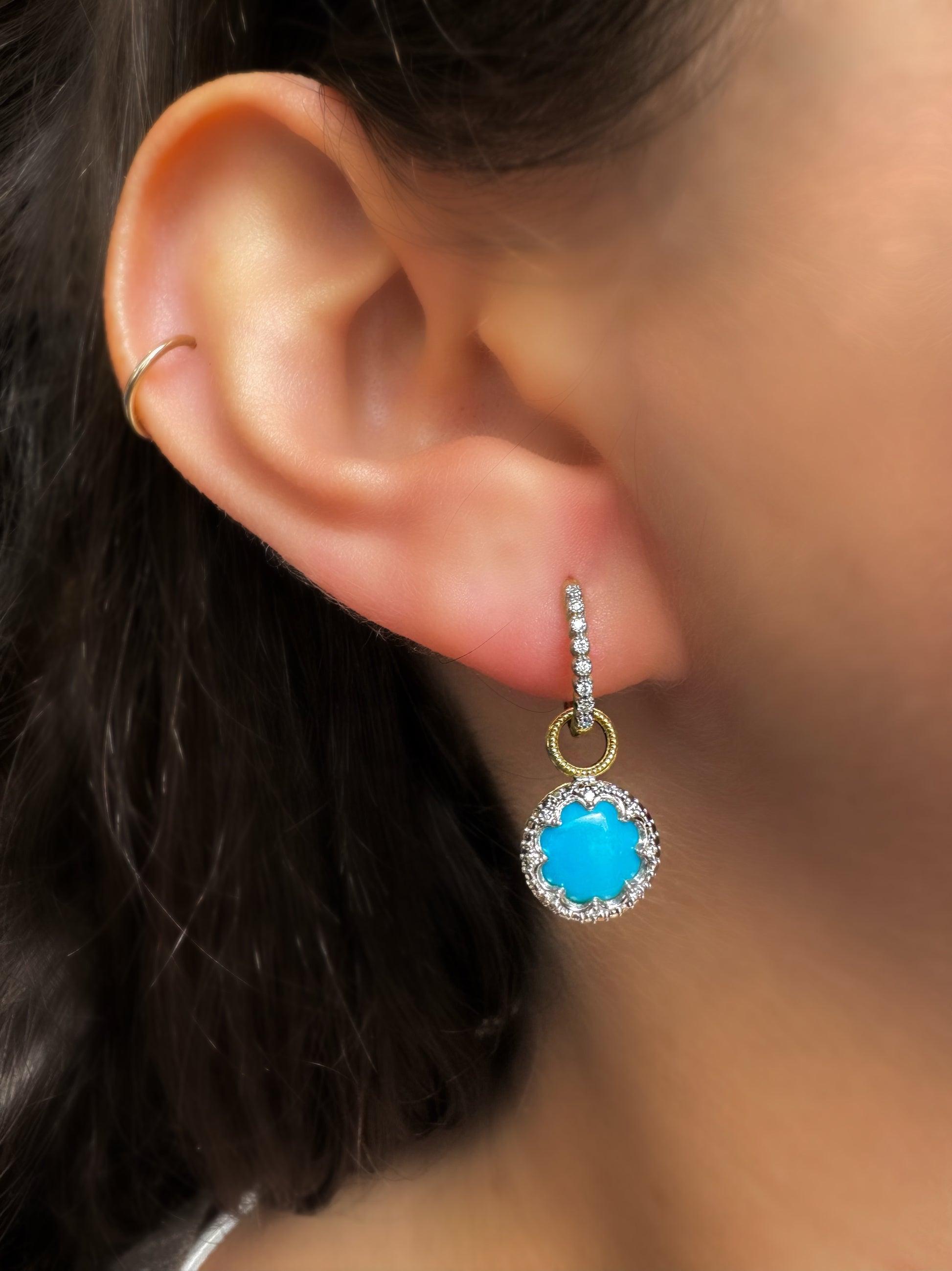 From the Provence Collection, the Provence Delicate Pave Trio Round Stone Earring Charms feature a round turquoise set in 18K gold surrounded by pave round diamond trios. Hoops and earring charms sold separately