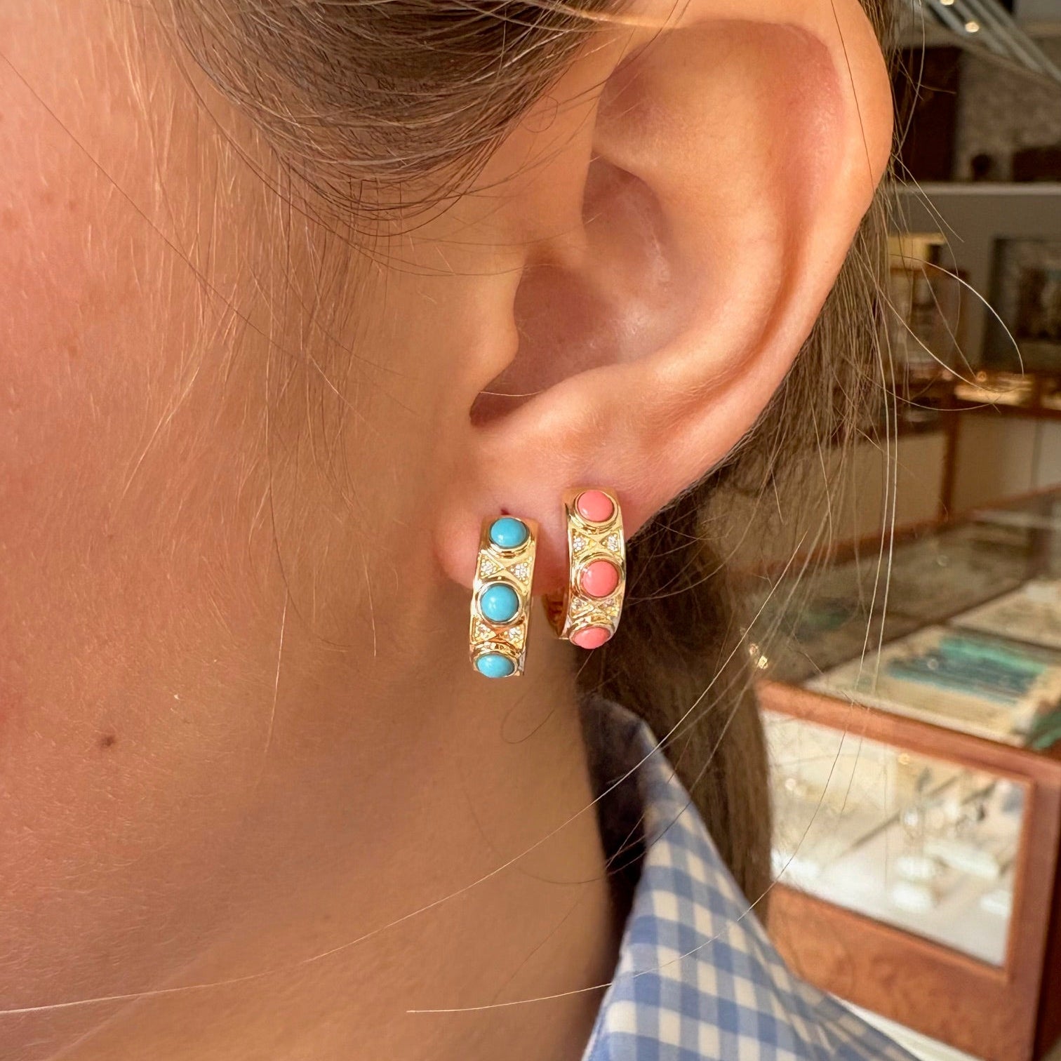 14k Yellow Gold Huggie earrings with Turquoise stones and triangular diamonds