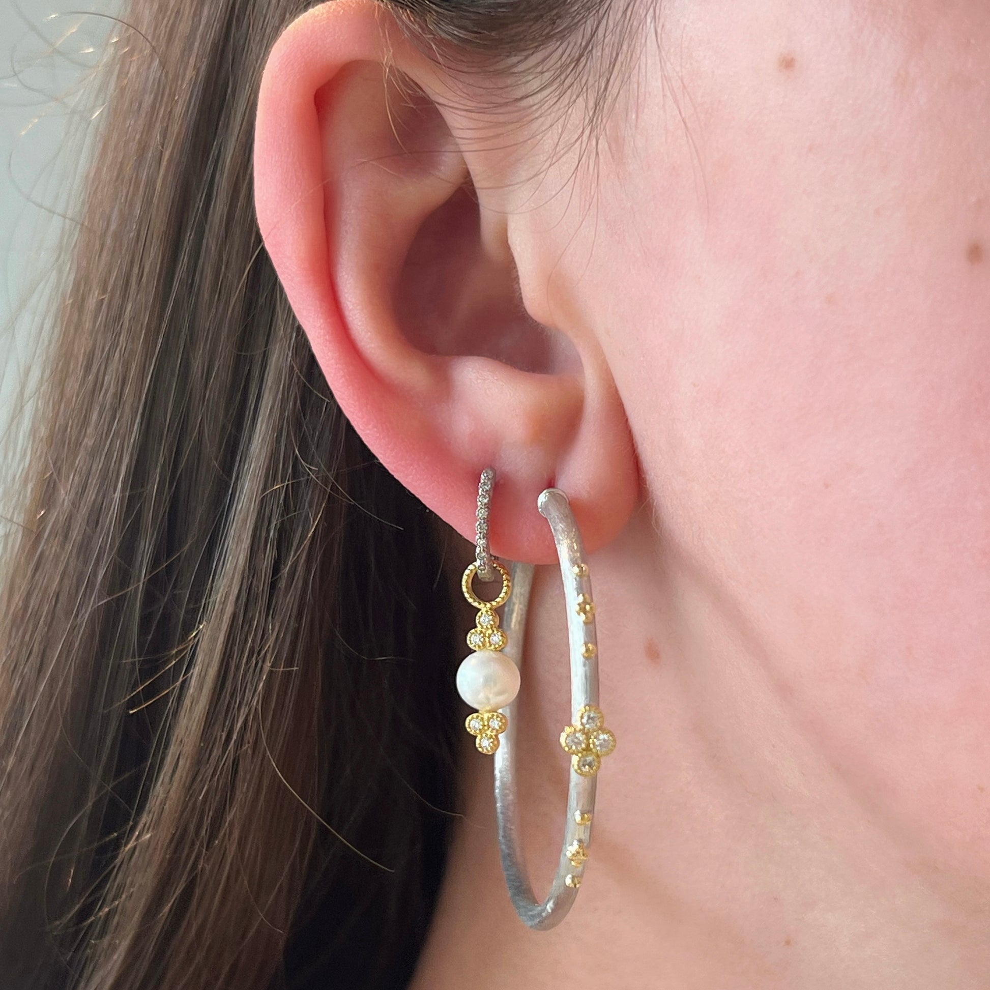 Delicate Provence Champagne Hoop Earrings feature bezel set round diamonds in 18K white gold with the signature brushed JFJ finish.